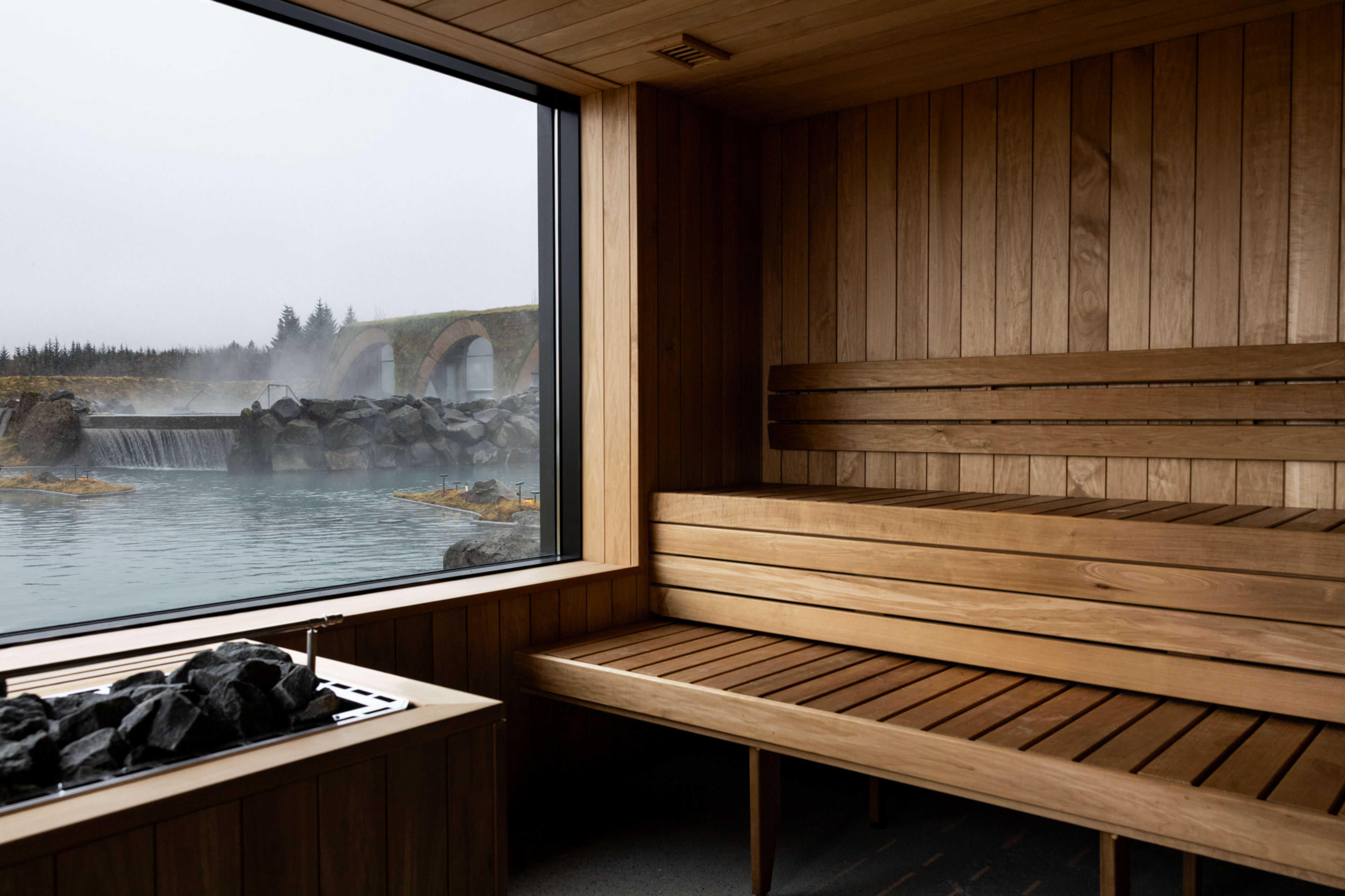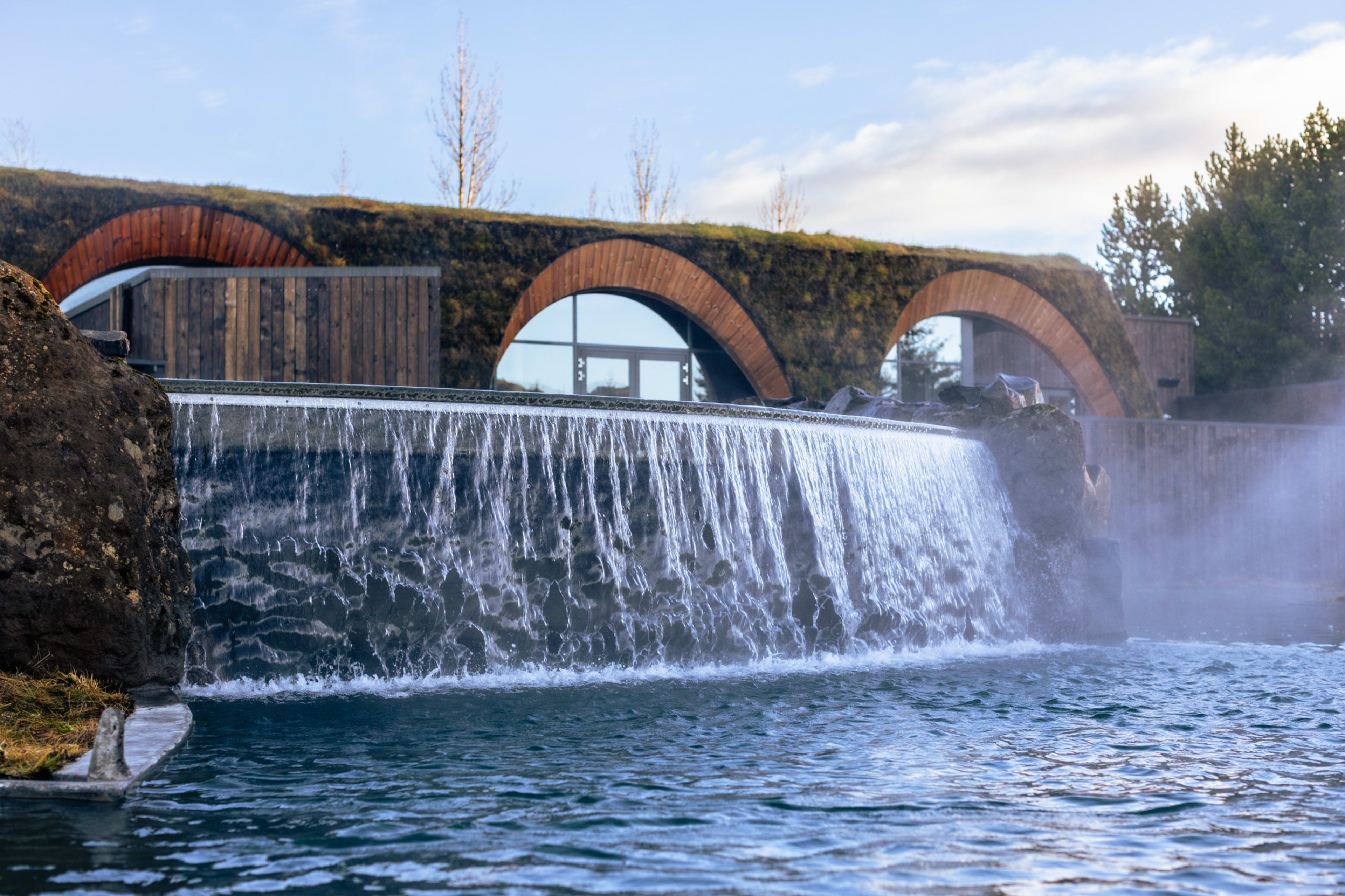 The building is designed to sit low in the landscape, with grass-covered rooflines, arch shapes drawn from local lava cave forms, and large windows looking out over the river and surrounding forest. The geothermal water is maintained between 38 and 40°C.