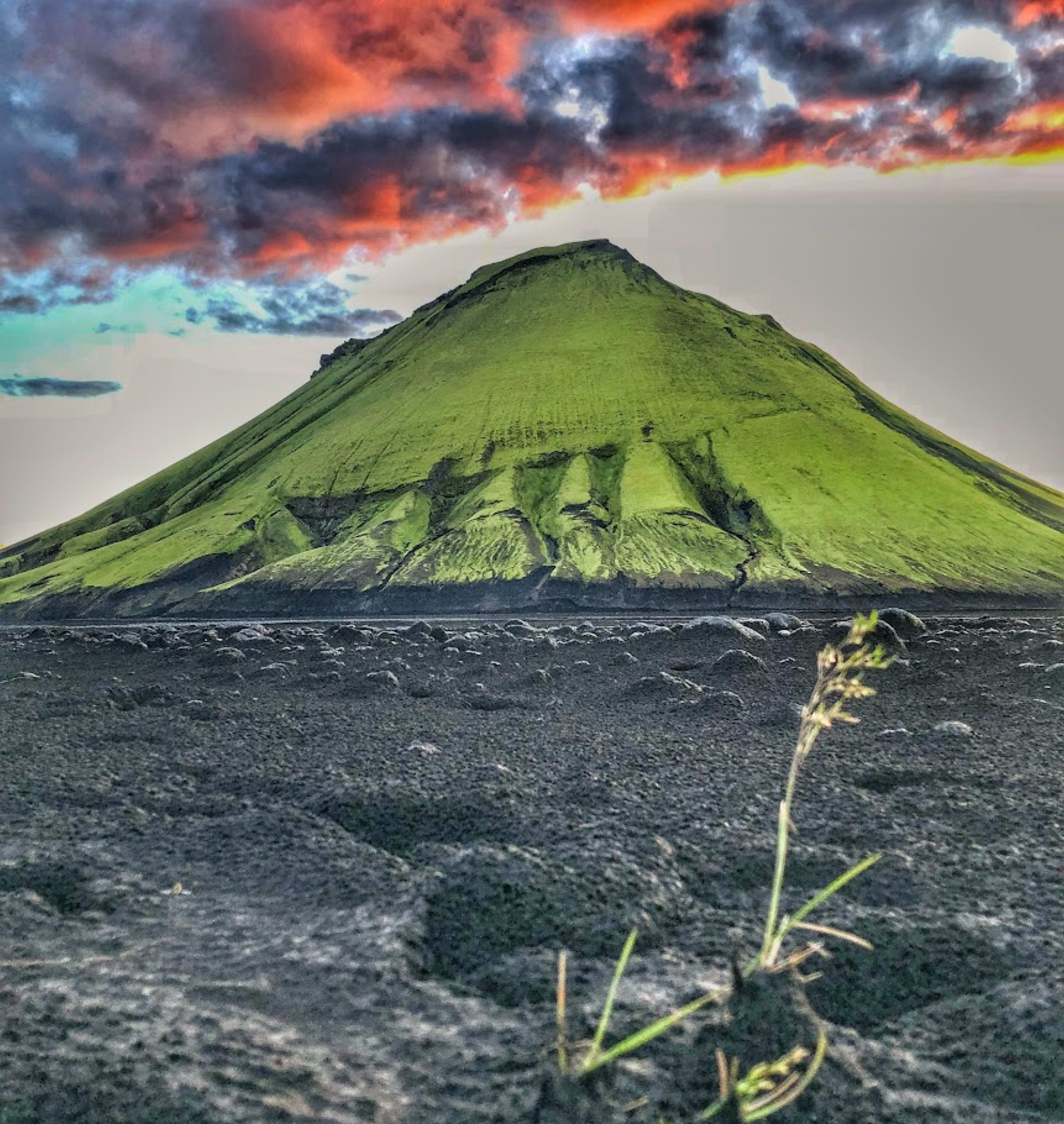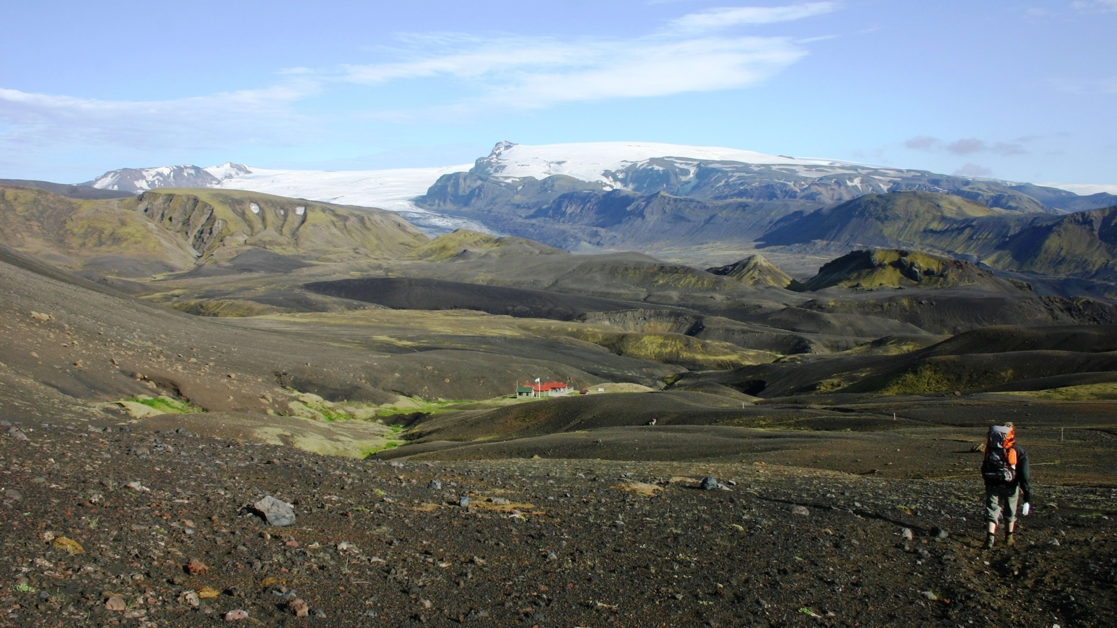Leaving the verdant oasis of Hvanngil behind, your route takes you into the vast black deserts of Mælifellssandur, a stark volcanic landscape of ash and sand stretching toward distant mountains. You'll hike toward the ancient Hattfell volcano, its green slopes rising from the dark sands, as you enter the Emstrur region where Icelandic farmers once brought their sheep for summer grazing.